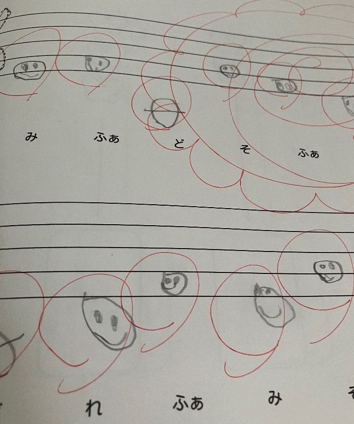 入会から3か月で、自分で書いたト音記号のドレミファソ(音符)をスラスラと読めるようになり、今はヘ音記号のドシラソファも、順調にがんばっています。
